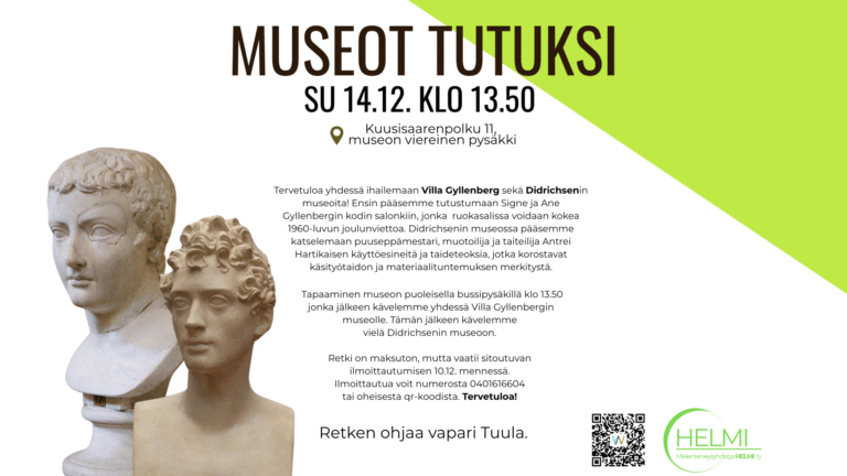 Tule ihailemaan yhdessä Villa Gyllenberg sekä Didrichsenin museoita! Ensin pääsemme tutustumaan Signe ja Ane Gyllenbergin kodin salonkiin, jonka ruokasalissa voidaan kokea 1960-luvun joulunviettoa. Didrichsenin museossa...