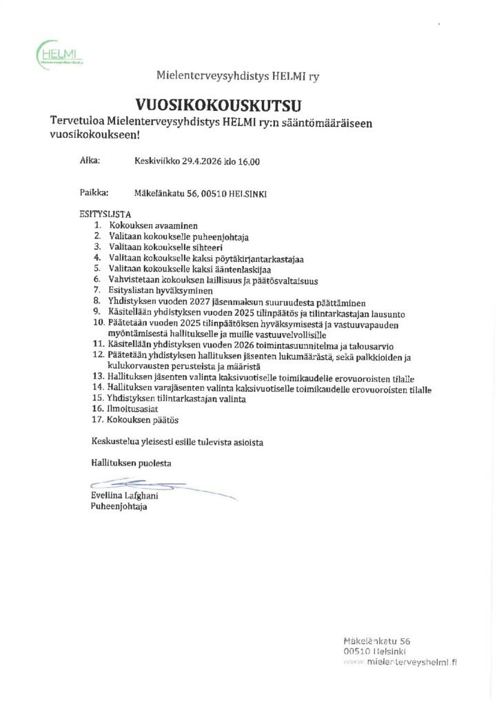 Tervetuloa yhdistyksen vuosikokoukseen Helmi-talolle (Mäkelänkatu 56)