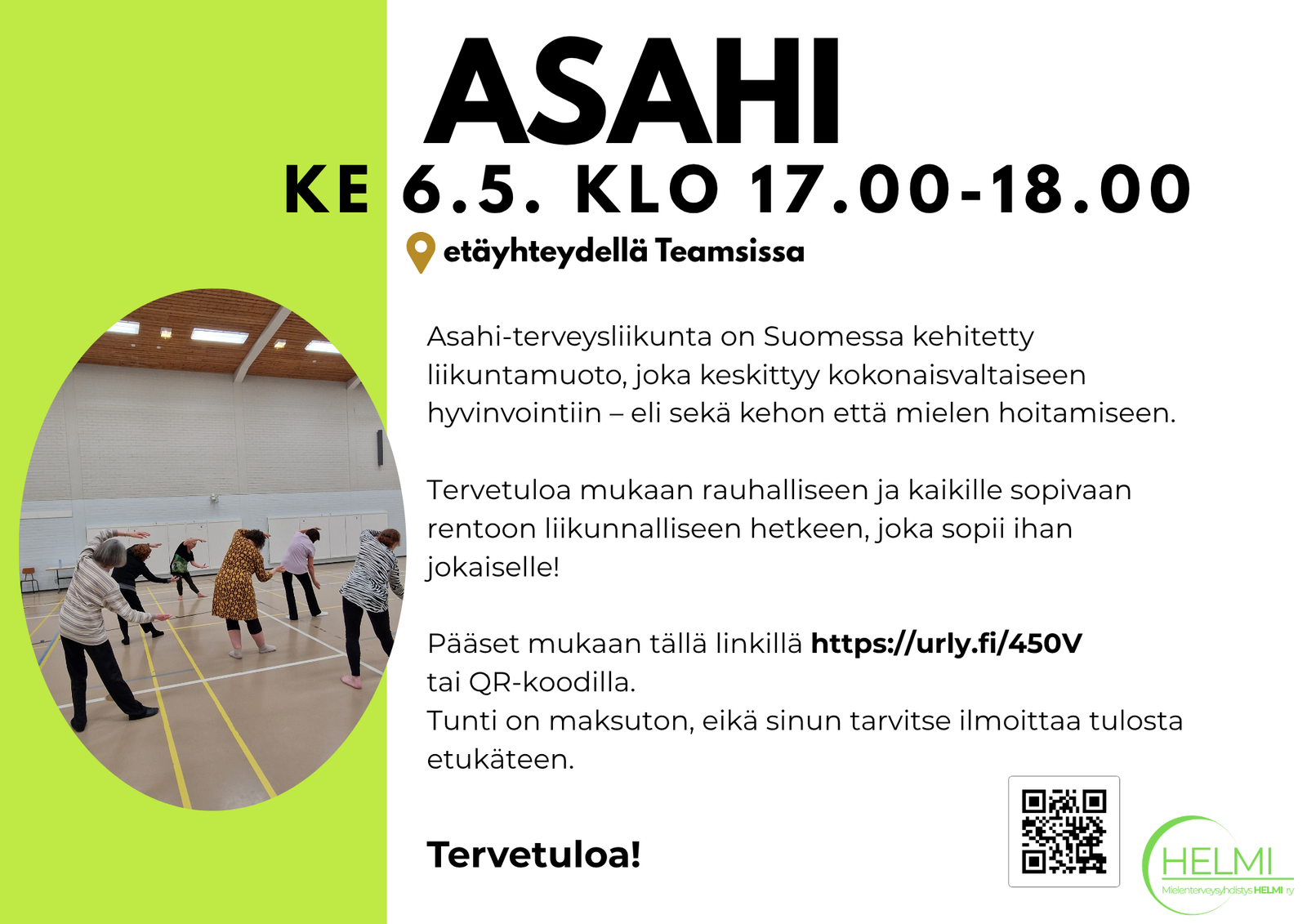 Asahi on rauhallista, pystyasennossa suoritettavaa liikuntaa, jossa tehdään yksinkertaisia liikkeitä hengityksen rytmissä. Tunnin aikana käydään koko keho läpi toistaen tiettyjä liikesarjoja, ilman musiikkia. Asahi sopii ihan jokaiselle ja aiempaa liikuntataustaa ei tarvitse olla, mutta toisaalta myös paljon liikkuvat hyötyvät tästä harjoituksesta.