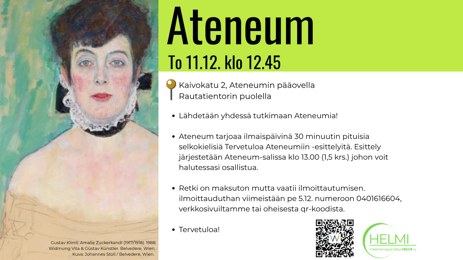• Ateneum tarjoaa ilmaispäivinä 30 minuutin pituisia selkokielisiä Tervetuloa Ateneumiin -esittelyitä. Esittely järjestetään Ateneum-salissa klo 13.00 (1,5 krs.) johon voit halutessasi osallistua.