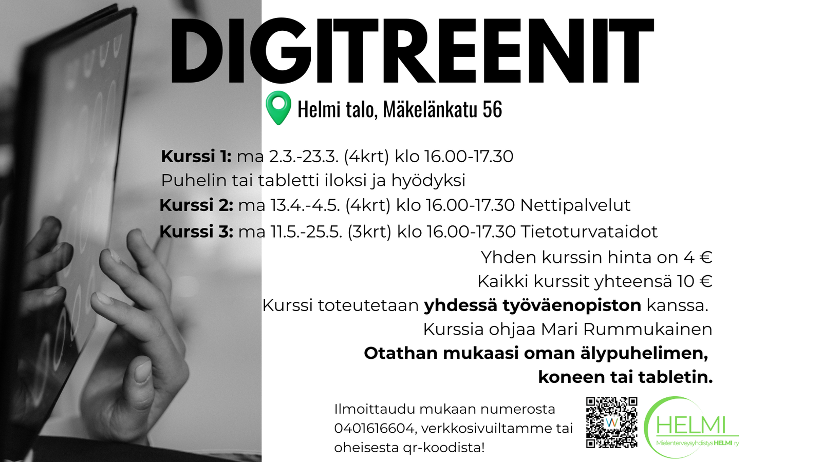 Kurssi kaksi: Tutustutaan arjen hyödyllisiin nettipalveluihin, jaetaan kokemuksia, harjoitellaan hyödyllisiä digitaitoja omalla mobiililaitteella. Kurssilla tehdään pari- ja ryhmäharjoituksia ja keskustellaan opittujen taitojen soveltamismahdollisuuksista.