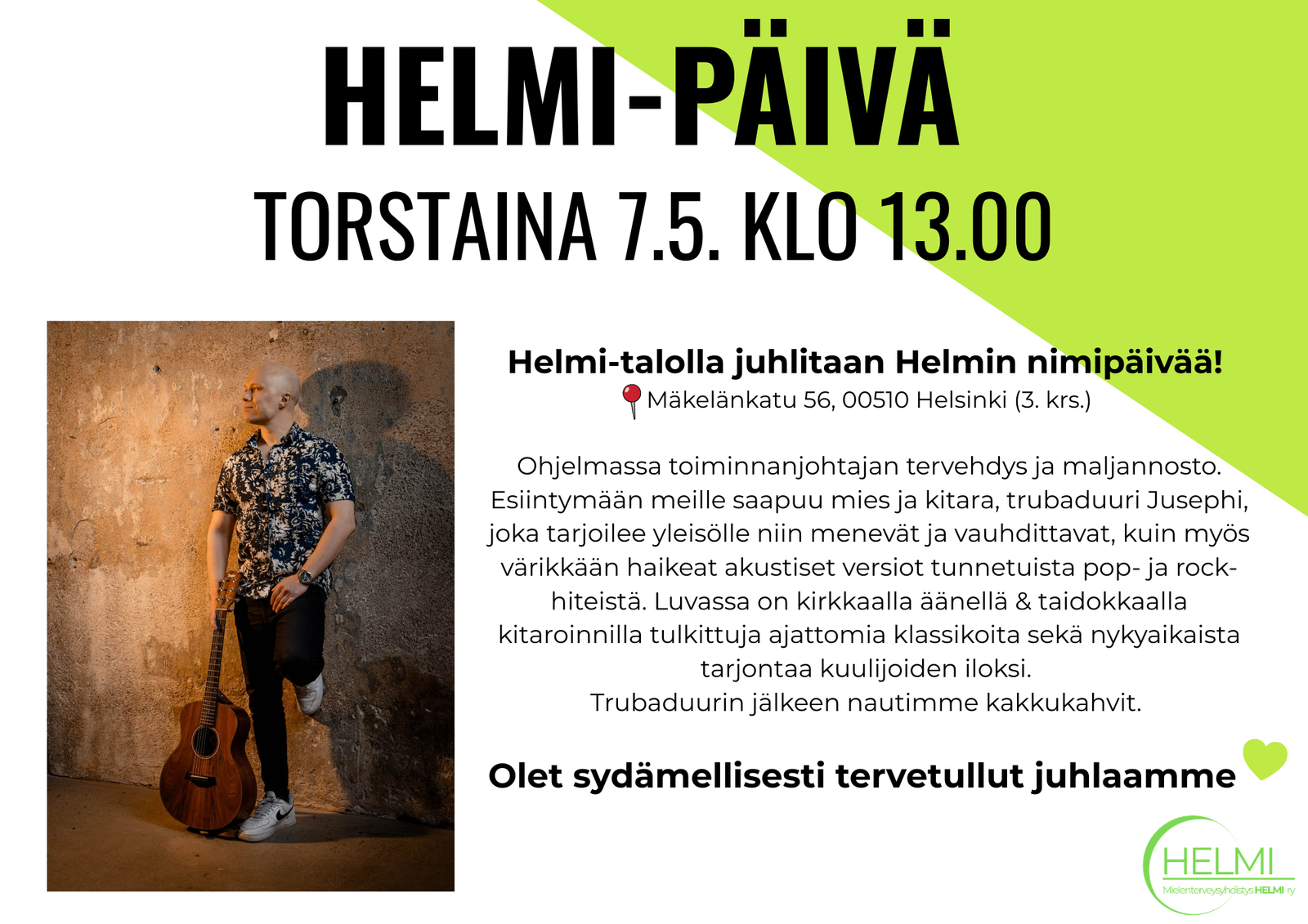 Ohjelmassa toiminnanjohtajan tervehdys ja maljannosto. Esiintymään meille saapuu mies ja kitara, trubaduuri Jusephi, joka tarjoilee yleisölle niin menevät ja vauhdittavat, kuin myös värikkään haikeat akustiset versiot tunnetuista pop- ja rock-hiteistä. Trubaduurin jälkeen nautimme kakkukahvit. Olet sydämellisesti tervetullut juhlaamme.