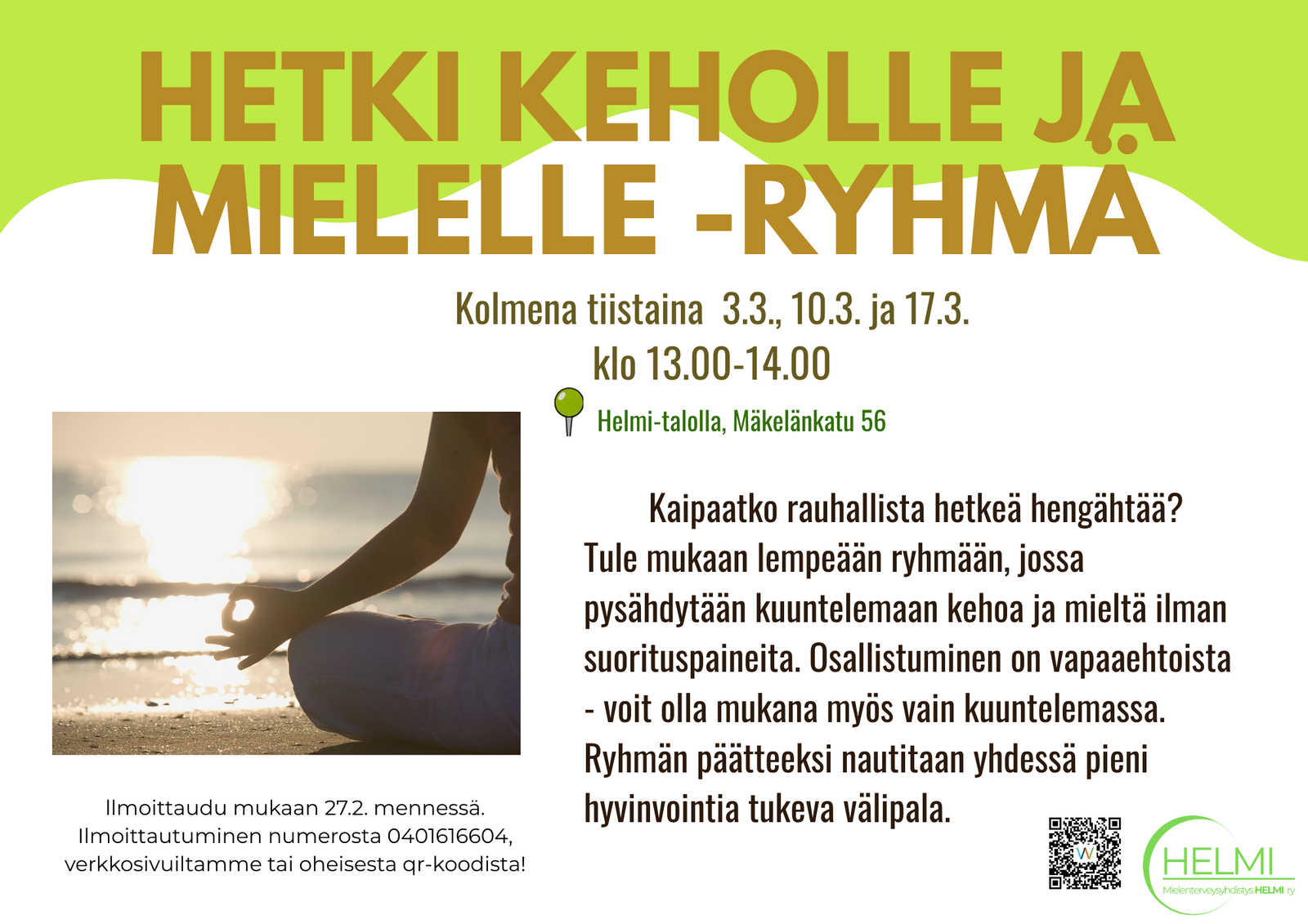 Tule mukaan lempeään ryhmään, jossa pysähdytään kuuntelemaan kehoa ja mieltä ilman suorituspaineita. Osallistuminen on vapaaehtoista – voit olla mukana myös vain kuuntelemassa.