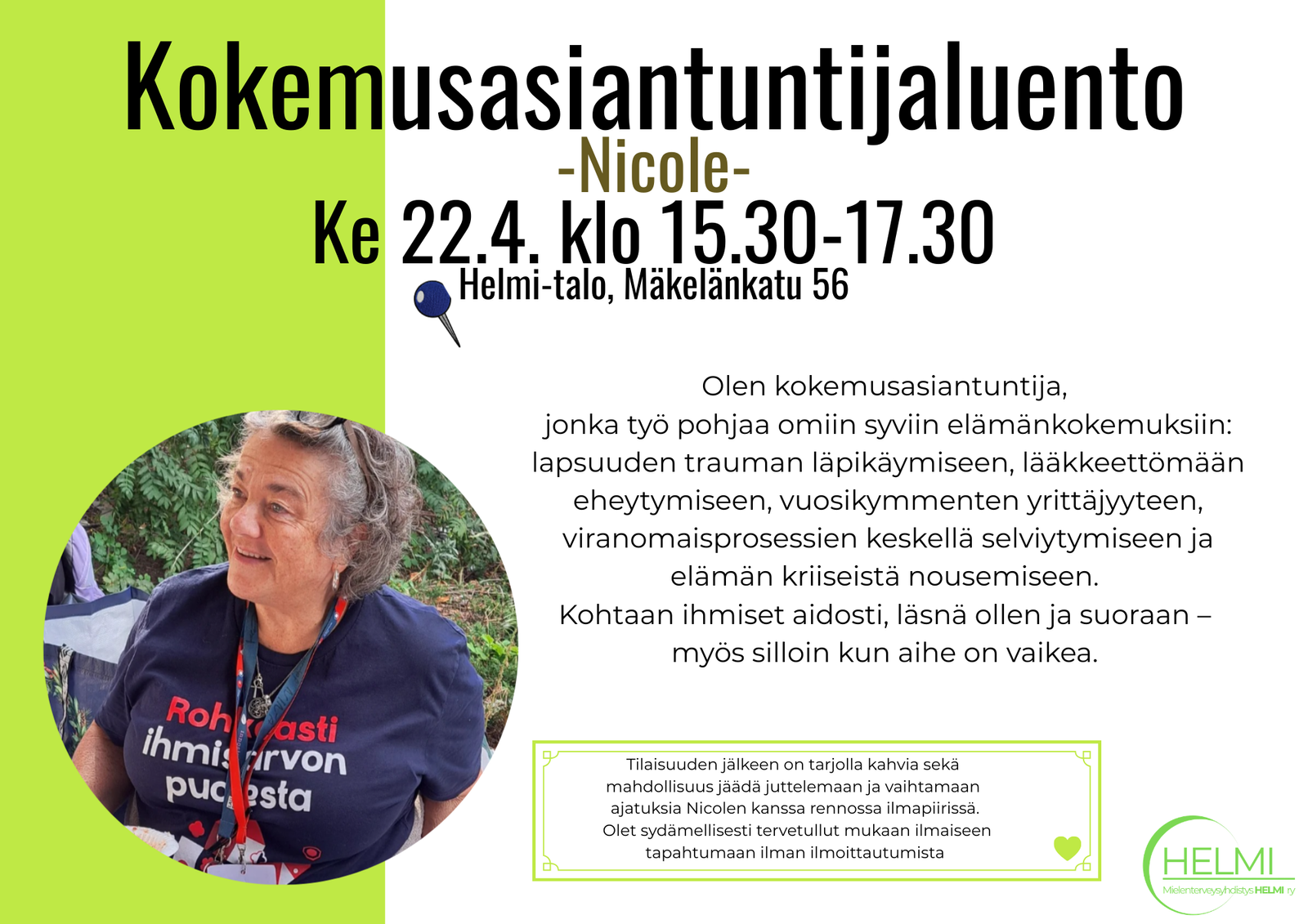 Olet sydämellisesti tervetullut mukaan ilmaiseen tapahtumaan ilman ilmoittautumista. Tilaisuuden jälkeen on tarjolla kahvia sekä mahdollisuus jäädä juttelemaan ja vaihtamaan ajatuksia Nicolen kanssa rennossa ilmapiirissä.