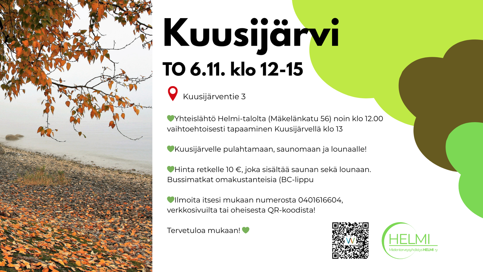 💚Ilmoita itsesi mukaan numerosta 0401616604, verkkosivuilta tai QR-koodista!