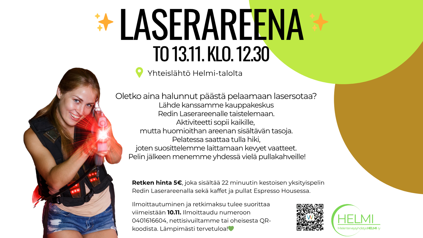 Lähde kanssamme kauppakeskus Redin Laserareenalle torstaina 13.11. Lähdemme yhteislähdöllä Helmi-talolta klo 12.30.
