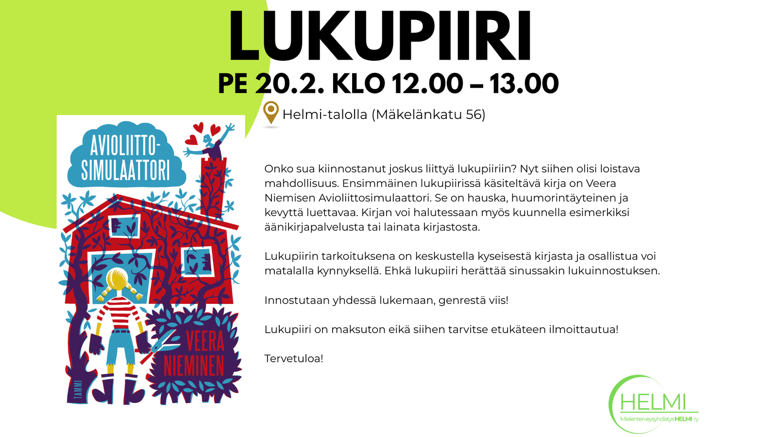 Lukupiiri on maksuton eikä siihen tarvitse etukäteen ilmoittautua!