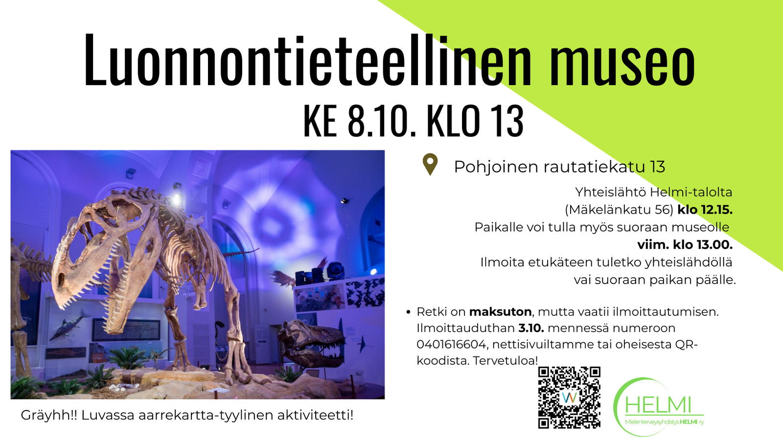 Retki on maksuton, mutta vaatii ilmoittautumisen. Ilmoittauduthan 3.10. mennessä numeroon 0401616604, nettisivuiltamme tai oheisesta QR-koodista. Tervetuloa!