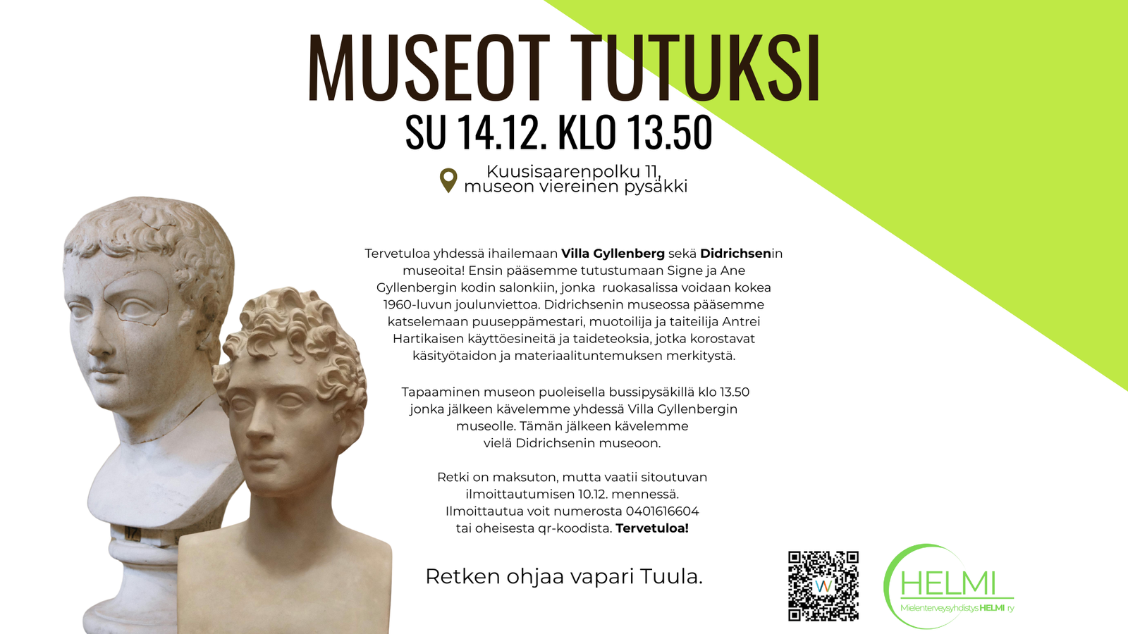 Tapaaminen su 14.12 klo 13.50 museon puoleisella bussipysäkillä, jonka jälkeen kävelemme yhdessä Villa Gyllenbergin museolle. Tämän jälkeen kävelemme vielä Didrichsenin museoon. Retken ohjaa vapari Tuula.