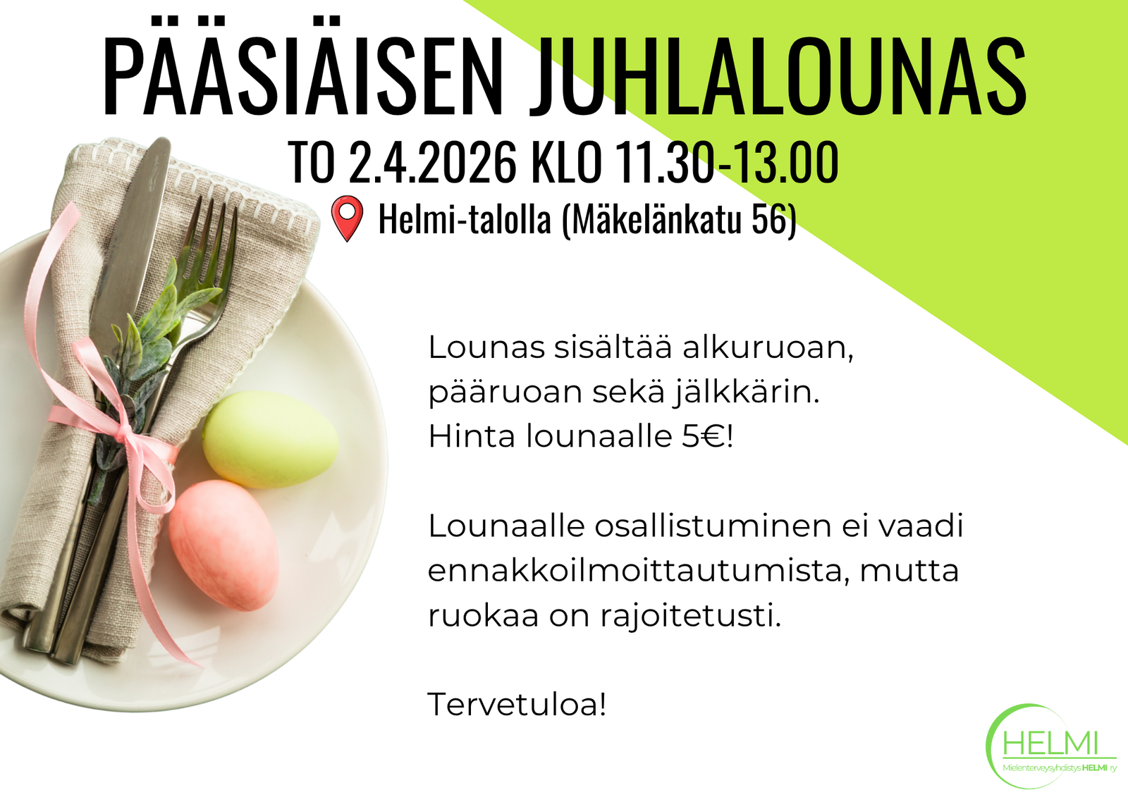 Tervetuloa nauttimaan pääsiäisen juhlalounas 5€ hintaan. Hintaan sisältyy alkuruoka, pääruoka ja jälkiruoka. Osallistuminen ei vaadi ilmoittautumista, mutta ruokaa on rajoitettu määrä. Tervetuloa mukaan!