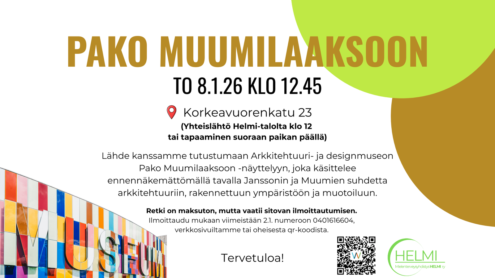 Lähde kanssamme tutustumaan Arkkitehtuuri- ja designmuseon Pako Muumilaaksoon -näyttelyyn, joka käsittelee ennennäkemättömällä tavalla Janssonin ja Muumien suhdetta arkkitehtuuriin, rakennettuun ympäristöön ja muotoiluun.