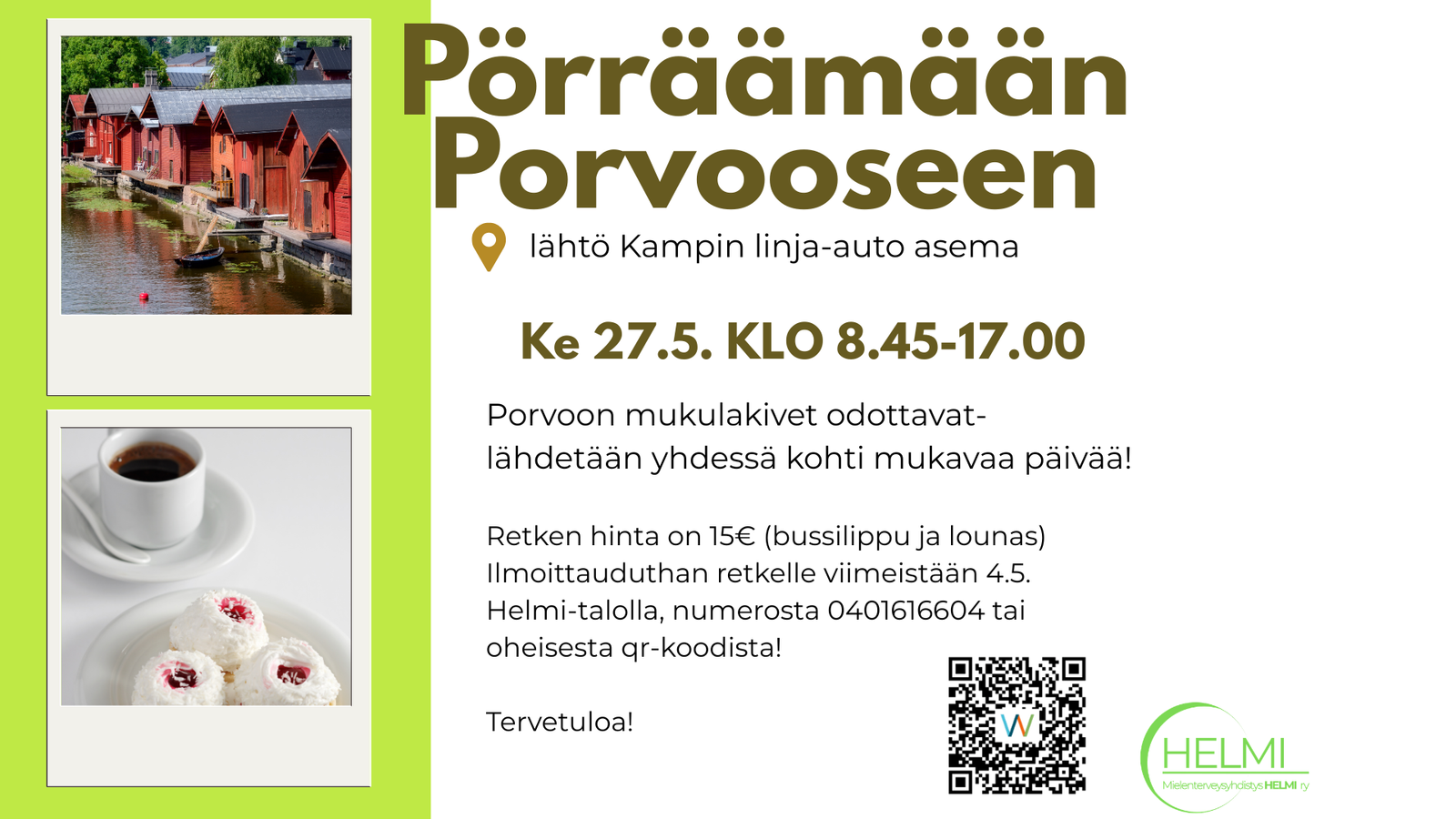 Retken hinta on 15€ (bussilippu ja lounas) Ilmoittauduthan retkelle viimeistään 4.5. Helmi-talolla, numerosta 0401616604 tai oheisesta qr-koodista!