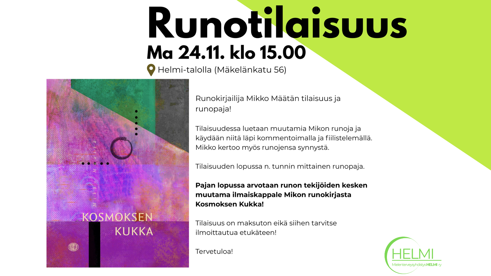 Tervetuloa runokirjailija Mikko Määtän järjestämään runotilaisuuteen ma 24.11 klo 15!