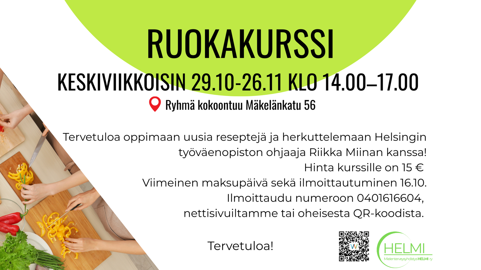 Ryhmä kokoontuu Helmi-talolla Mäkel´änkatu 56. Tervetuloa oppimaan uusia reseptejä ja herkuttelemaan Helsingin työväenopiston ohjaaja Saimin kanssa! Hinta kurssille on 15 € Viimeinen maksupäivä sekä ilmoittautuminen 16.10.
