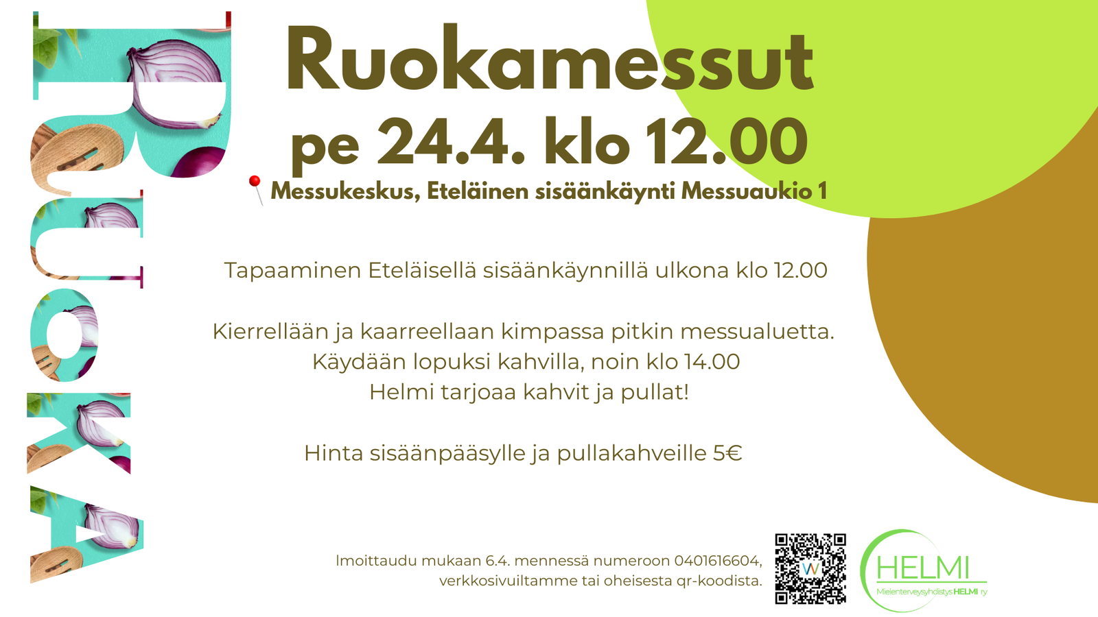 Tapaaminen Eteläisellä sisäänkäynnillä ulkona klo 12.00. Kierrellään ja kaarreellaan kimpassa pitkin messualuetta. Käydään lopuksi kahvilla, noin klo 14.00 Helmi tarjoaa kahvit ja pullat!