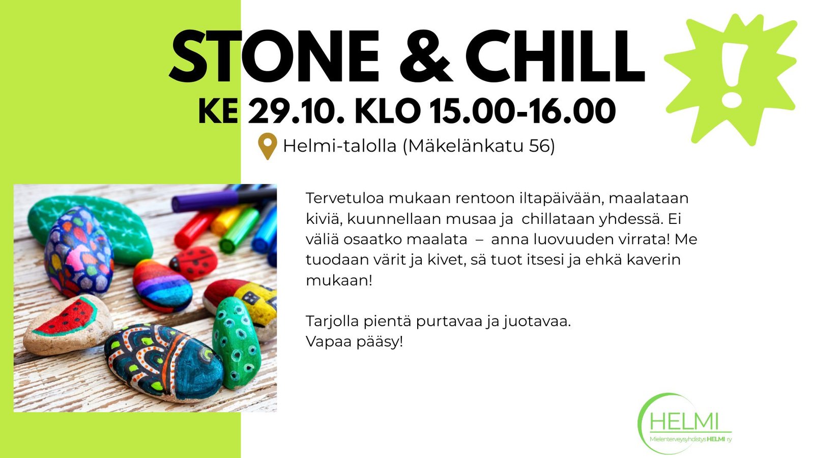 Tervetuloa mukaan rentoon iltapäivään, maalataan kiviä, kuunnellaan musaa ja chillataan yhdessä. Ei väliä osaatko maalata – anna luovuuden virrata! Me tuodaan värit ja kivet, sä tuot itsesi ja ehkä kaverin mukaan!