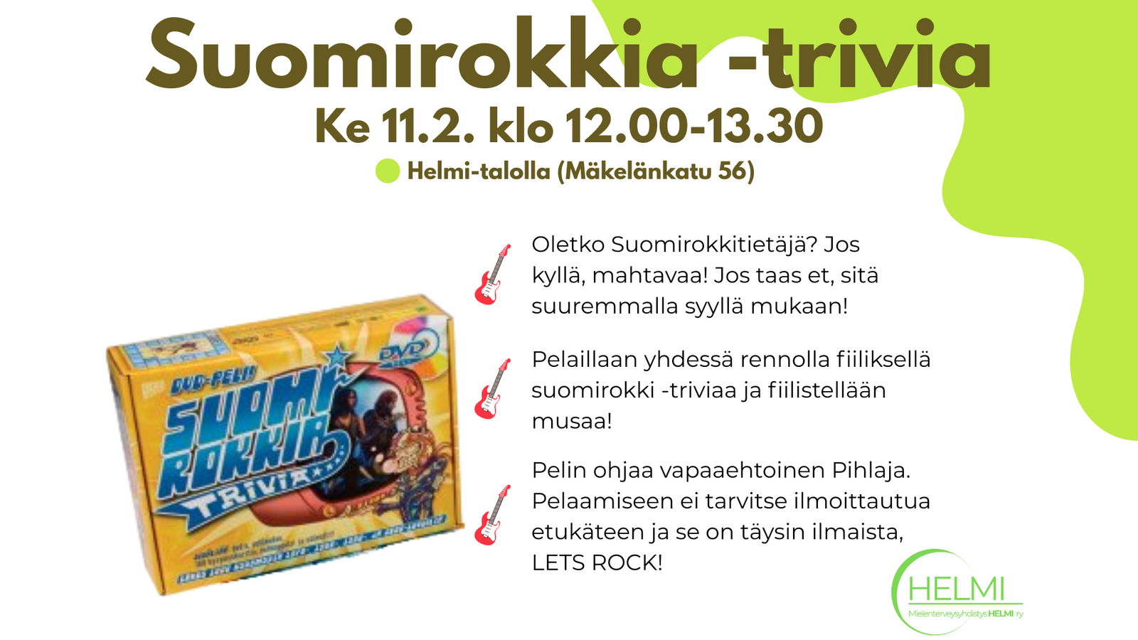 Pelin ohjaa vapaaehtoinen Pihlaja. Pelaamiseen ei tarvitse ilmoittautua etukäteen ja se on täysin ilmaista, LETS ROCK!