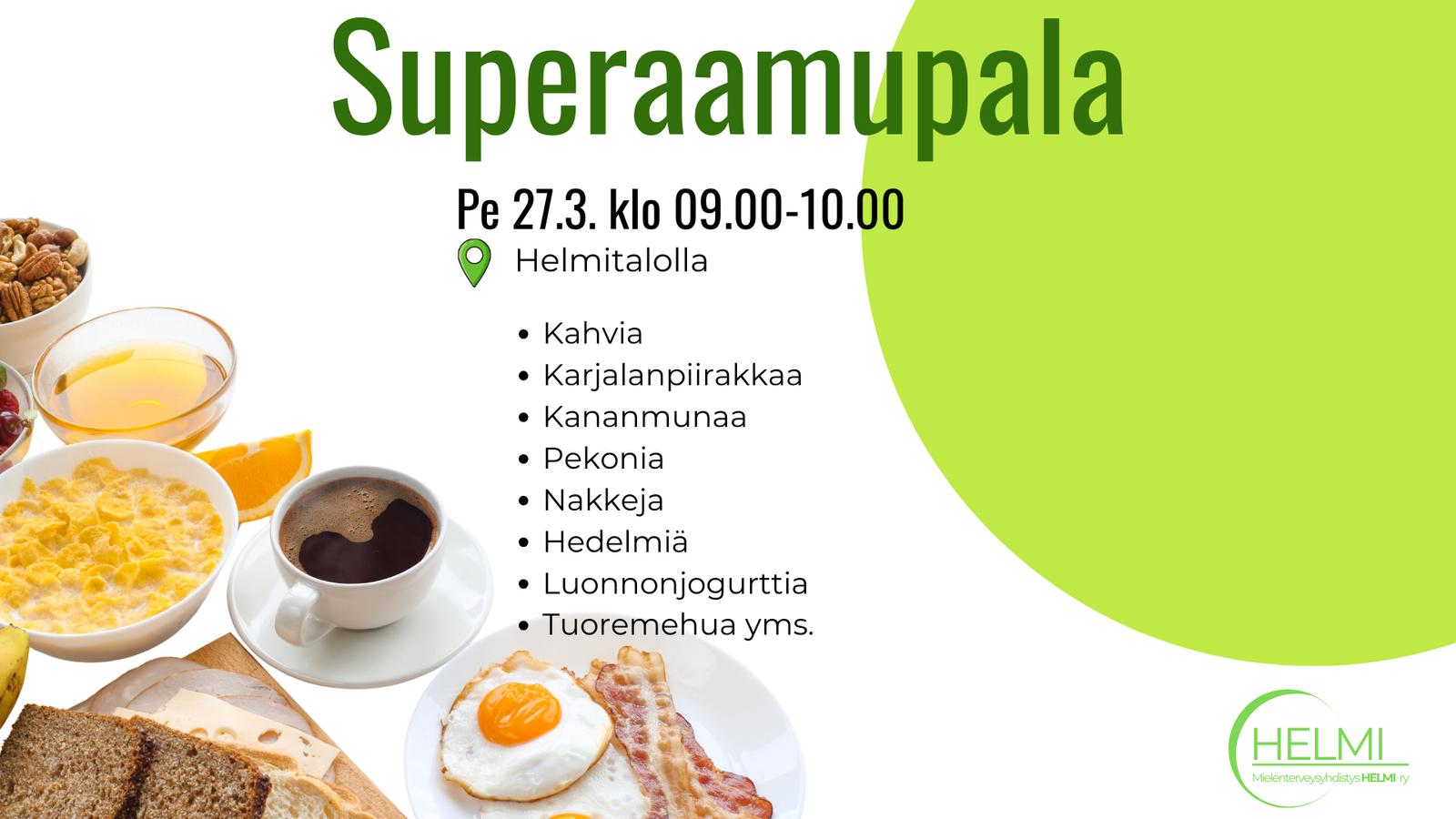 Herkullinen aamupala vaihtuvin valikoimin.