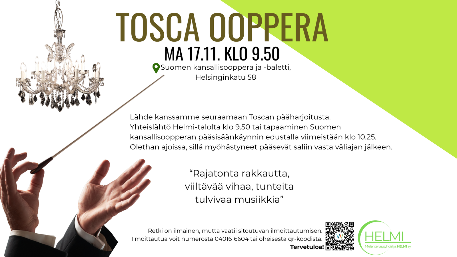 Yhteislähtö Helmi-talolta klo 9.50 tai tapaaminen Suomen kansallisoopperan pääsisäänkäynnin edustalla viimeistään klo 10.25. Olethan ajoissa, sillä myöhästyneet pääsevät saliin vasta väliajan jälkeen!