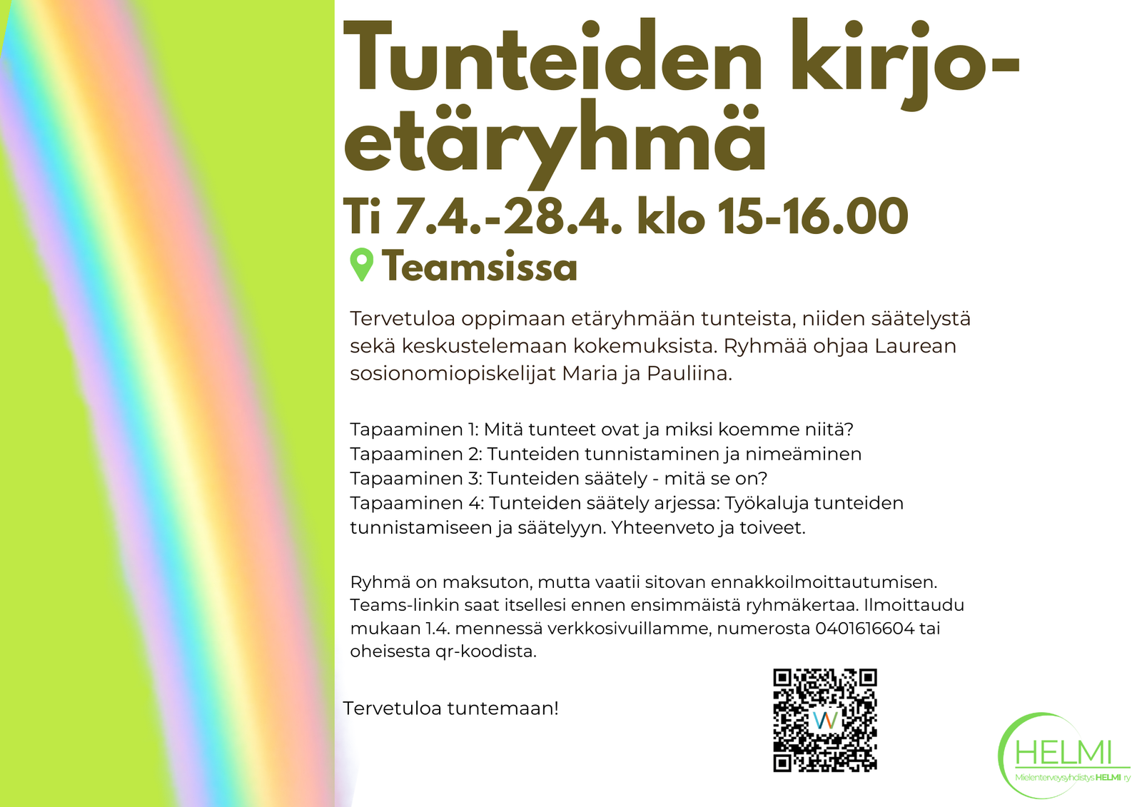 Ryhmä on maksuton, mutta vaatii sitovan ennakkoilmoittautumisen. Teams-linkin saat itsellesi ennen ensimmäistä ryhmäkertaa. Ilmoittaudu mukaan 1.4. mennessä verkkosivuillamme, numerosta 0401616604 tai oheisesta qr-koodista.