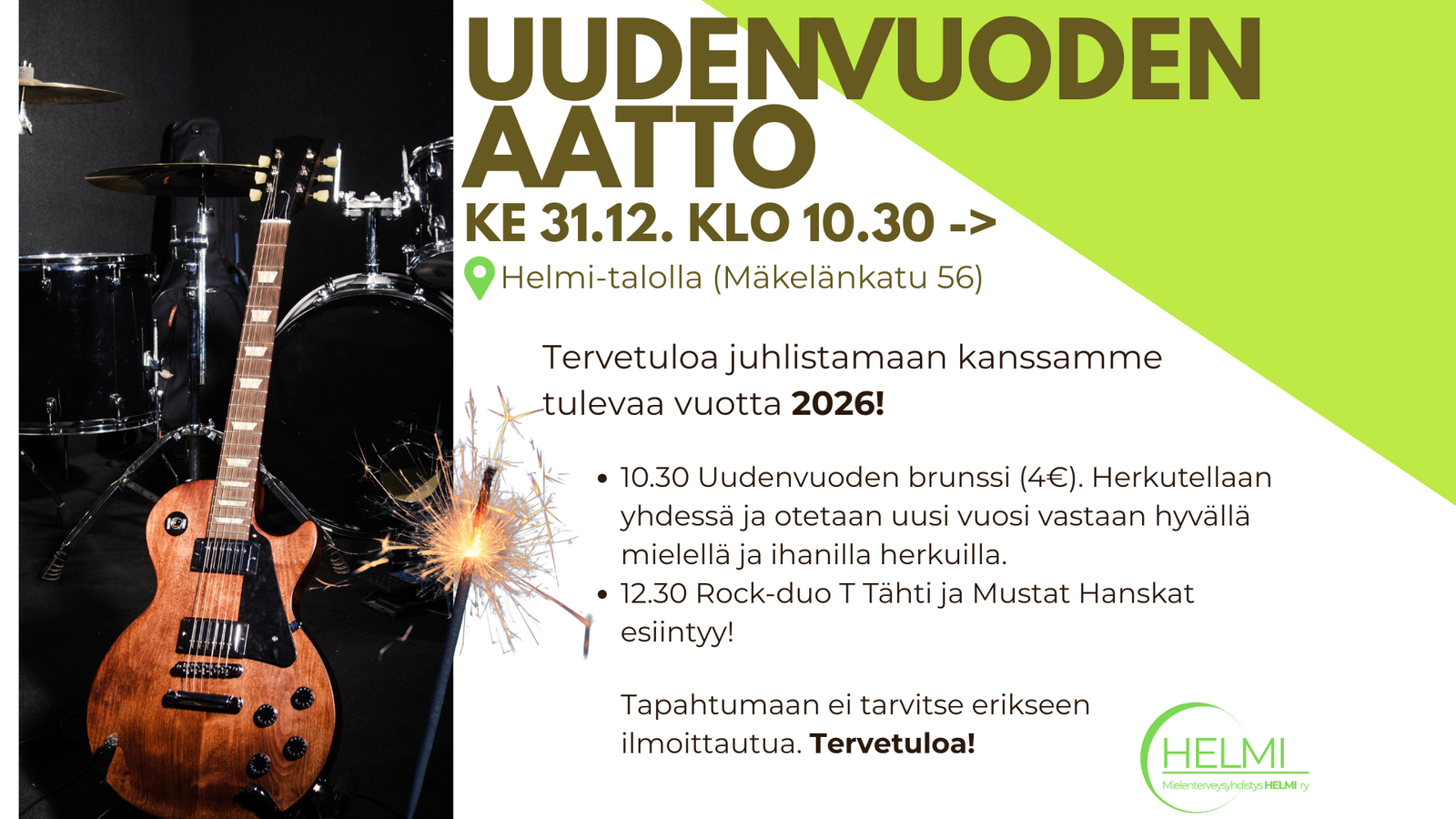 • 10.30 Uudenvuoden brunssi (4€). Herkutellaan yhdessä ja otetaan uusi vuosi vastaan hyvällä mielellä ja ihanilla herkuilla.