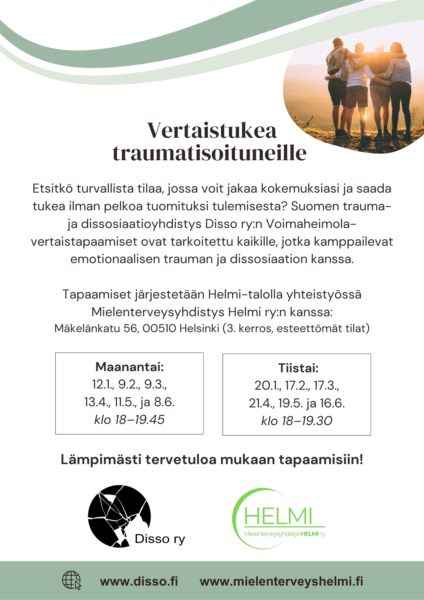 Etsitkö turvallista tilaa, jossa voit jakaa kokemuksiasi ja saada tukea ilman pelkoa tuomituksi tulemisesta? Suomen trauma- ja dissosiaatioyhdistys Disso ry:n Voimaheimola-vertaistapaamiset ovat tarkoitettu kaikille, jotka kamppailevat emotionaalisen trauman ja dissosiaation kanssa.
