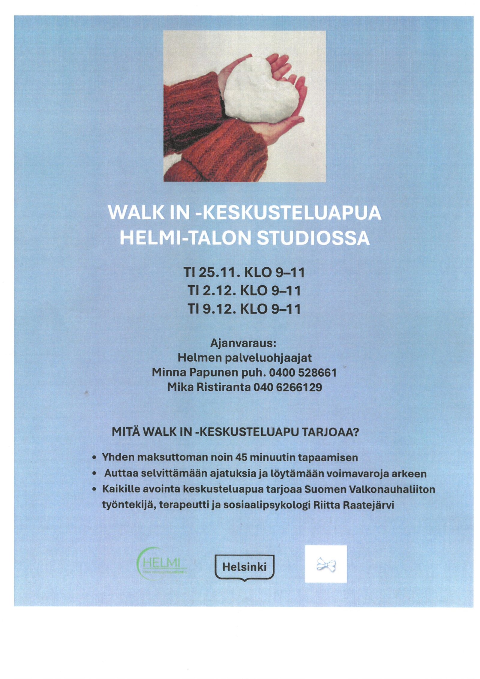 TI 25.11., 2.12. ja 9.12. klo 9.00-11.00 Helmi-talolla, studiossa.